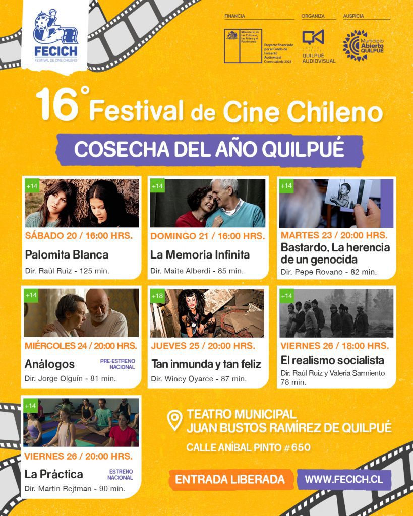 El pasado viernes 19 comenzó la 16ª versión del Festival de Cine Chileno, FECICH, que hasta la fecha ha exhibido 32 películas y seguirá mostrando lo mejor del cine chileno hasta el sábado 27 de enero en Quilpué. Todas las funciones son con entrada liberada y el acceso es por orden de llegada.