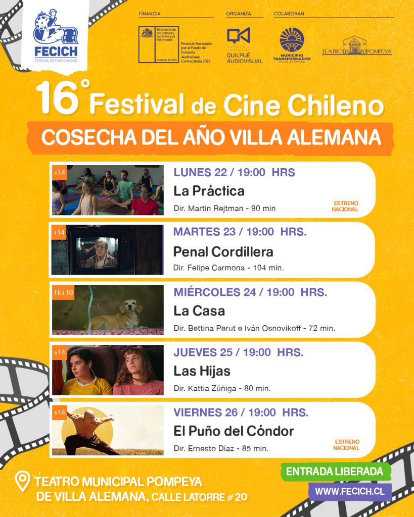 Mientras que, en el horario de las 19:00 horas, sigue la Cosecha del Año. El miércoles con “La Casa”, de los directores Bettina Perut e Iván Osnovikoff; el jueves con “Las Hijas” de Kattia G. Zúñiga. Y finalmente, el viernes 26 terminan las funciones en la comuna con “El Puño del Cóndor”, la última película de Ernesto Díaz y Marko Zaror, referida a las artes marciales.